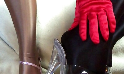 Sensual teasing close up gams and feet in Shiny glossy pantyhose and high high-heeled slippers.